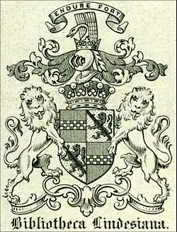 James Ludovic Lindsay, 26th Earl of Crawford and 9th Earl of Balcarres, KT, FRS, FRAS (28 July 1847 – 31 January 1913)[1][2] was a Scottish astronomer, politician, ornithologist, bibliophile and philatelist. A member of the Royal Society, Crawford was elected president of the Royal Astronomical Society in 1878.[3][4][5][6] He was a prominent Freemason, having been initiated into Isaac Newton University Lodge at the University of Cambridge in 1866.[7]