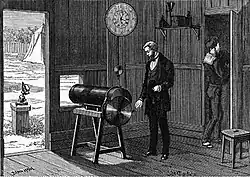 The British expeditions photographed the transit from different geographic points by using apparatuses inspired by the revolver of Janssen.[2] Unfortunately, the quality of the resulting images of the two expeditions was not sufficient to accurately calculate the Astronomical Unit, and the observations were more reliable at eye. Even so, Janssen introduced his revolver to the Société Francaise de Photographie in 1875 and the Académie des Sciences in 1876, to which he suggested the possibility of using his apparatus for the study of the animal movement, especially of the birds, because of the rapidity of the movement of their wings.[3]