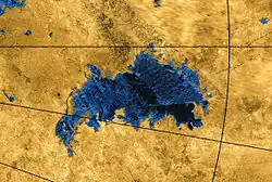 Jingpo Lacus is a lake in the north polar region of Titan,[1] the planet Saturn's largest moon. It and similarly sized Ontario Lacus[2] are the largest known bodies of liquid on Titan after the three maria (Kraken Mare, Ligeia Mare, and Punga Mare).[3] It is composed of liquid hydrocarbons (mainly methane and ethane). It is west of Kraken Mare at 73° N, 336° W, roughly 240 km (150 mi) long,[1][note 1] similar to the length of Lake Onega on Earth. Its namesake is Jingpo Lake,[1] a lake in China.