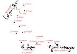 In his letter to the king, Mestre João Faras provided a rudimentary sketch of the stars of the southern hemisphere sky, in an attempt to identify the Southern Pole Star, although he apologised to the king for not having taken their precise height measurements (he blamed it on his bad leg). He identified the five-star constellation now known as the Southern Cross, which he named "las Guardas", as they were always bright and visible above the horizon. But he recognized they were not the elusive pole star of the south. Instead, he tentatively pointed out two lower stars (small and bright, possibly Chi Octantis and Mu Hydri[15] as possible candidates for the southern pole star ("el polo antartyco"). He rounded off his letter on a pessimistic note, suggesting that it was probably better for ships to continue trying to navigate by the altitude of the sun (via the astrolabe), rather than hoping to find the Southern Pole Star with a quadrant.