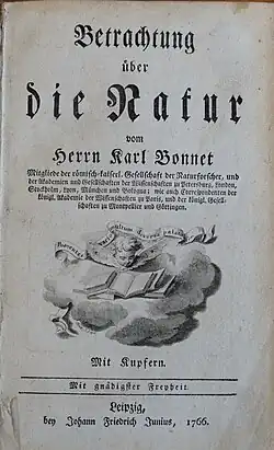 Titius was also active in biology, particularly in classification of organisms and minerals.[4] His biological work was influenced by Linnaeus. Lehrbegriff der Naturgeschichte Zum ersten Unterrichte, his most extensive publication in biology, was on systematic classification of plants, animals, and minerals, as well as the elemental substances ether, fire, air, water and earth.[5]
