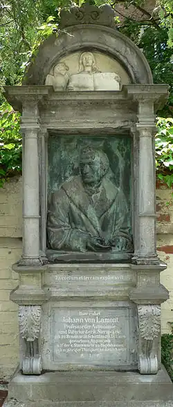 His many honours include ForMemRS and FRSE. In 1867 he was awarded the Merit Order of the Bavarian Crown by the King of Bavaria, through which Lamont was ennobled and permitted to use the predicate "von". The statue on his tomb in Munich has him with an open hand, into which the locals put small coins. In 1934 the Deeside Field Club erected a granite memorial cairn in his memory at Inverey, Scotland. It was unveiled by Sir James Jeans.[1]