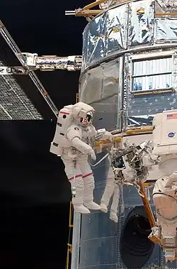 STS-125 Space Shuttle Atlantis (May 11–24, 2009) was the fifth and final servicing mission to the Hubble Space Telescope. Atlantis launched from Kennedy Space Center Launch Pad 39A May 11, 2009, at 2:01 p.m. EDT, and landed on May 24, 2009 at California's Edwards Air Force Base.[20][21] During the mission, Grunsfeld performed three of the mission's five back-to-back spacewalks, which installed two new instruments to the Hubble Space Telescope: The Cosmic Origins Spectrograph, and the Wide Field Camera 3. The mission also replaced a Fine Guidance Sensor, six new gyroscopes, and two battery unit modules, to allow the telescope to continue to function at least through 2014.[22][23] One issue Grunsfeld and his crew experienced during the overhaul was the stripping of 10mm bolts due to improper assembly and technique which he discussed again on Car Talk.