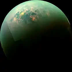 Enceladus is a small icy moon, seemingly similar in chemical makeup to comets,[3] with jets or geysers of water erupting from its surface that might be connected to active hydrothermal vents at its subsurface water ocean floor,[4][5][6][7][8] where the moon's ocean meets the underlying rock, a prime habitat for life.[9][10] The geysers could provide easy access for sampling the moon's subsurface ocean, and if there is microbial life in it, ice particles from the sea could contain the evidence astrobiologists need to identify them.[11] An organic-rich world, Titan has a methane cycle comparable in atmospheric and geological processes to Earth's water cycle.