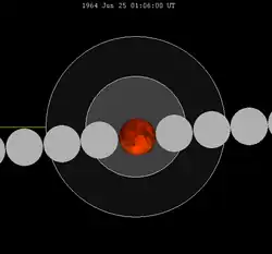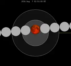 ![]() The greatest eclipse of the series occurred on 2000 Jul 16, lasting 106 minutes, 24 seconds.[8] |