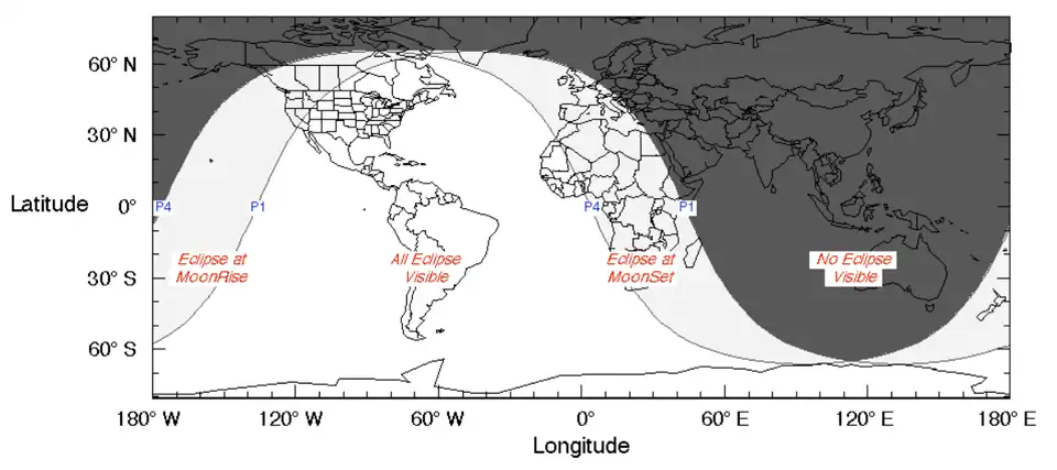The eclipse was completely visible over North and South America and west Africa, seen rising over northwestern North America and the central Pacific Ocean and setting over much of Africa and western Europe.[3]