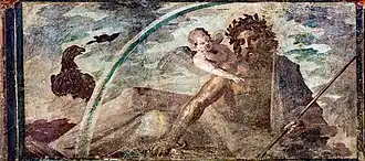 Painting of a bearded, seated Jupiter, unclothed from the waist up and holding a staff