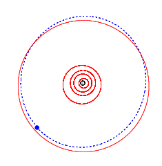 The second theory proposes that the Jupiter trojans were captured during the migration of the giant planets described in the Nice model. In the Nice model the orbits of the giant planets became unstable 500–600 million years after the Solar System's formation when Jupiter and Saturn crossed their 1:2 mean-motion resonance. Encounters between planets resulted in Uranus and Neptune being scattered outward into the primordial Kuiper belt, disrupting it and throwing millions of objects inward.[31] When Jupiter and Saturn were near their 1:2 resonance the orbits of pre-existing Jupiter trojans became unstable during a secondary resonance with Jupiter and Saturn. This occurred when the period of the trojans' libration about their Lagrangian point had a 3:1 ratio to the period at which the position where Jupiter passes Saturn circulated relative to its perihelion. This process was also reversible allowing a fraction of the numerous objects scattered inward by Uranus and Neptune to enter this region and be captured as Jupiter's and Saturn's orbits separated. These new trojans had a wide range of inclinations, the result of multiple encounters with the giant planets before being captured.[32] This process can also occur later when Jupiter and Saturn cross weaker resonances.[33]