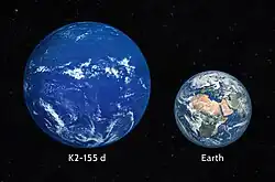 K2-155d is a potentially habitable Super-Earth exoplanet in the K2-155 system.[5] It is the outermost of three known planets orbiting around the K-type star K2-155 in the constellation Taurus, approximately 290 light years (90 parsecs) from Earth.[6] It is one of 15 new exoplanets around red dwarf stars discovered by Japanese astronomer Teruyuki Hirano of the Tokyo Institute of Technology and his team.[1] The team used data from NASA's Kepler Space Telescope during its extended K2 "Second Light" mission. K2-155d orbits near the so-called habitable zone of its system, and has the potential to host liquid water.[7][5]