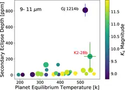 K2-28b is a sub-Neptune sized planet orbiting its star in only 2.26 days. Despite its short orbital period the equilibrium temperature of the planet is a relatively low 500 Kelvin due to the low luminosity of the parent star.[4] Because of the very small size of the parent star, this planet is a particularly favorable target for transmission spectroscopy by the James Webb Space Telescope, which should be able to determine if the atmosphere is cloudy or clear by observing roughly 5 transits.[9] Among a group of small and cool planets orbiting relatively bright M-dwarfs, its predicted secondary eclipse depth of 230 parts-per-million is second only to Gliese 1214 b.[3]