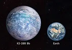 K2-288Bb is unusual for having a radius not commonly seen among most exoplanets. At 1.90 R🜨, it falls within the so-called Fulton gap between 1.5 and 2.0 R🜨. This is the range of sizes where rocky super-Earths start to accumulate thick volatile layers and turn into mini-Neptunes.[2] Planets in the middle of this gap are uncommon, and as such, not much is known about them. K2-288Bb could either be a low-density mini-Neptune like GJ 9827 d, or a large rocky super-Earth like LHS 1140 b.[1] Its mass is currently unknown and would require additional studies using the Radial velocity method to be determined. Based on its size, K2-288Bb is probably still undergoing atmospheric evolution and/or erosion. The planet is also orbiting in or near the habitable zone of K2-288B, where temperatures are just right for a planet to host liquid water with the right atmosphere. K2-288 Bb has an equilibrium temperature of 226.36 K (−46.79 °C; −52.22 °F) (lower than Earth's 255 K (−18 °C; −1 °F)) and receives less sunlight than Earth.[2]