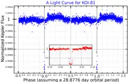 ![]() A light curve for KOI-81, adapted from van Kerkwijk et al. (2010).[1] The inset plot shows the eclipse on an expanded scale. | |