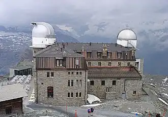Because of the good climatic conditions at the altitude of 3135 m (10285 ft), astronomical observatories have been located in both towers of the Kulmhotel at Gornergrat since 1967. In 1985, the KOSMA telescope was installed in the southern tower by the Universität zu Köln and, in the course of 1995, replaced by a new dish and mount. In the northern tower, a 1.5 m infrared telescope was operated until 2005 by an Italian association of universities (TIRGO).