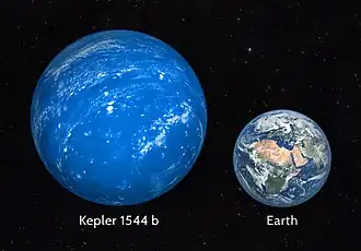 ![]() Size comparison of the planet Kepler-1544b (artistic concept) with Earth | |