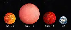 Size comparison of the three planets of Kepler 65 with a known radius (artistic concept) with Earth