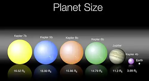 Kepler-7b is one of the first five exoplanets to be confirmed by NASA's Kepler spacecraft, and was confirmed during the first 34 days of Kepler's science operations.[2] It orbits a star slightly hotter and significantly larger than the Sun that is expected to soon reach the end of the main sequence.[2] Kepler-7b is a hot Jupiter that is about half the mass of Jupiter, but is nearly 1.5 times its size; at the time of its discovery, Kepler-7b was the second most diffuse planet known, surpassed only by WASP-17b.[2] It orbits its host star every five days at a distance of approximately 0.06 AU (9,000,000 km; 5,600,000 mi). Kepler-7b was announced at a meeting of the American Astronomical Society on January 4, 2010. It is the first extrasolar planet to have a crude map of cloud coverage.[7][8][9]