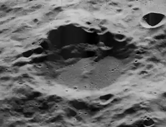 This is an older, worn feature, particularly along the western edge where ejecta material covers the rim and part of the inner walls and floor. The rim has been eroded to the point where it is not sharply defined, and both the edge and inner wall are rounded and relatively featureless. There is a small crater along the eastern rim. The interior floor is relatively featureless, except for the ejecta on the western edge. The west rim of the crater rises to a peak whose summit is over 6 km above the crater floor.[1]