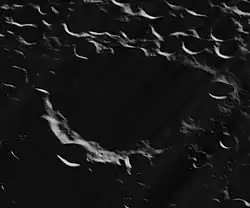 The rim of this crater is marked in several locations by smaller impacts that lie along or across the side. Only the west-northwestern part is relatively free from impacts. The northeastern rim is somewhat indented into the interior of the crater. Within the interior the floor is relatively featureless and level, with only a few tiny craterlets to mark the surface.