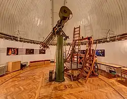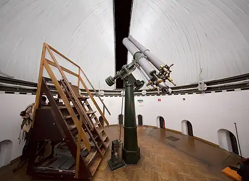 The great refractor is a double telescope, with a primary of 270 mm (27 cm) aperture objective lens, and was built by Repsold and also Steinheill; it was installed at the observatory in 1886.[1]