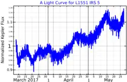 L1551 IRS 5 is a protostellar envelope surrounding a binary protostar system in the constellation of Taurus 450 light-years from Earth. The binary system itself is known as L1551 NE,[4] and each star is surrounded by protoplanetary disk.[5] The system is one of Jim Kaler's The 100 greatest stars.[6]