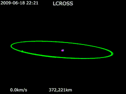 LCROSS launched with the LRO aboard an Atlas V rocket from Cape Canaveral, Florida, on June 18, 2009, at 21:32 UTC (17:32 EDT). On June 23, four and a half days after launch, LCROSS and its attached Centaur booster rocket successfully completed a lunar swingby and entered into polar Earth orbit with a period of 37 days, positioning LCROSS for impact on a lunar pole.[11][12]