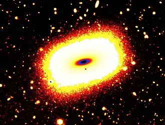 ![]() False color image of galaxy LEDA 74886, taken by the Subaru Telescope. The contrast of this image has been adjusted to highlight the internal disk/bar like structure. | |