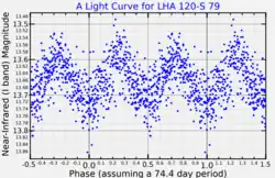 ![]() A light curve for LHA 120-S 79, Adapted from Manick et al. (2018). The data were folded with the "formal period" which is twice the 37.2 fundamental period. [1] | |