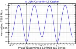 LZ Cephei was discovered to be a binary star by William Edmund Harper in 1931.[7] The orbital elements were first calculated by Robert Methven Petrie in 1962.[7] It was discovered to be a variable star in 1972 by N. Kameswara Rao, using the Lick Observatory's 24 inch telescope.[8] The star was given the variable star designation LZ Cephei in 1973.[9] It was classified as an ellipsoidal variable by Hill et al. in 1976.[10]