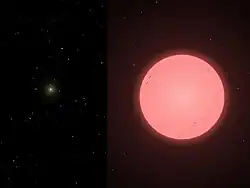 Calculations with La Superba's luminosity and effective temperature give it a radius of about 315 R☉.[9] If it were placed at the position of the Sun, the star's surface would extend beyond Earth's orbit.