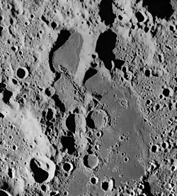 Lacus Solitudinis (Latin sōlitūdinis, "Lake of Solitude") is a small lunar mare on the far side of the Moon. The selenographic coordinates of the lake are 27.8° S, 104.3° E, and it lies within a diameter of 139 km. It forms an arcing feature with the concave side oriented to the northwest. The eastern edge is relatively continuous, while the west is more irregular and disrupted by small craters.[1]