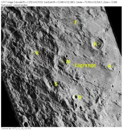 By convention these features are identified on lunar maps by placing the letter on the side of the crater midpoint that is closest to Lagrange.