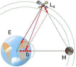 - The Earth–Moon L4 and L5 points contain concentrations of interplanetary dust, known as Kordylewski clouds.[13][14] Stability at these specific points is greatly complicated by solar gravitational influence.[15]