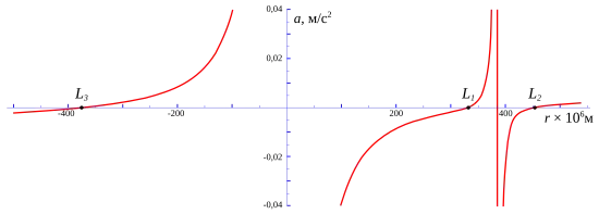 The radial acceleration a of an object in orbit at a point along the line passing through both bodies is given by: where r is the distance from the large body M1, R is the distance between the two main objects, and sgn(x) is the sign function of x. The terms in this function represent respectively: force from M1; force from M2; and centripetal force. The points L3, L1, L2 occur where the acceleration is zero — see chart at right. Positive acceleration is acceleration towards the right of the chart and negative acceleration is towards the left; that is why acceleration has opposite signs on opposite sides of the gravity wells.