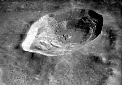 Lalande is a small lunar impact crater that lies in the central part of the visible Moon, on the eastern edge of Mare Insularum. It was named after French astronomer Jérôme Lalande.[1] The crater is surrounded by a high-albedo area of ejecta that extends into a ray system with a maximum radius of over 300 kilometers. The interior wall has a terrace system, and there is a small central rise at the midpoint of the floor. It was formed during the Copernican period of the moon extending from 1.1 billion years ago to the present. Its young age is indicated by the bright rays of ejecta surrounding the crater, its sharp features, and the relative lack of later impacts in its interior.[2] The rays of ejecta from Lalande overlay the ejecta rays from Copernicus Crater, meaning it is younger than Copernicus, and thus no more than 800 million years old.[3]