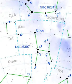 Lambda Arae is a star in the southern constellation of Ara. Its name is a Bayer designation that is Latinized from λ Arae, and abbreviated Lambda Ara or λ Ara. The apparent visual magnitude of this star is 4.77,[2] making it bright enough to be seen with the naked eye. Based on parallax measurements, it is located at a distance of 68 light-years (21 parsecs) from Earth. This star is drifting further away from the Sun with a radial velocity of +3 km/s.[5]