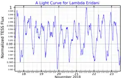 λ Eri is classified in the General Catalogue of Variable Stars as a Beta Cephei variable.[13] The AAVSO International Variable Star Index defines a LERI type of variation. λ Eri is classified as LERI + GCAS since it shows both short term periodic variations and longer timescale eruptive variation.[6] It was one of the first stars where short-period variations were found.[4] The line profile variability periods are 0.702d and 0.269d, with intermittently present periods of 0.6d and 0.75d. The photometric amplitude of the variation is 0.010 magnitude.[5]
