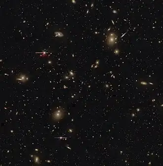 The Leo Cluster (Abell 1367) is a galaxy cluster about 330 million light-years distant (z = 0.022[1]) in the constellation Leo, with at least 70 major galaxies. The galaxy known as NGC 3842 is the brightest member of this cluster.[4] Along with the Coma Cluster, it is one of the two major clusters comprising the Coma Supercluster,[5] which in turn is part of the CfA2 Great Wall, which is hundreds of millions light years long and is one of the largest known structures in the universe.[6]