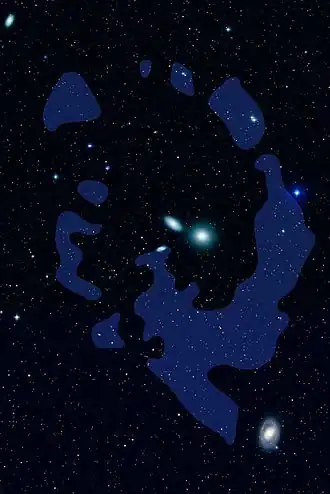The Leo Ring is an immense intergalactic cloud of hydrogen and helium gas some 650 kilolight-years (200 kpc) in diameter, in orbit of two galaxies, in the center of the Leo Group of galaxies, within the constellation of Leo.