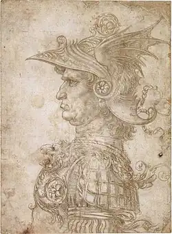 In 1506, Leonardo was summoned to Milan by Charles II d'Amboise, the acting French governor of the city.[69] There, Leonardo took on another pupil, Count Francesco Melzi, the son of a Lombard aristocrat, who is considered to have been his favourite student.[36] The Council of Florence wished Leonardo to return promptly to finish The Battle of Anghiari, but he was given leave at the behest of Louis XII, who considered commissioning the artist to make some portraits.[69] Leonardo may have commenced a project for an equestrian figure of d'Amboise;[70] a wax model attributed to him survives and would be the only extant example of Leonardo's sculpture, but the attribution is not widely accepted. Leonardo was otherwise free to pursue his scientific interests.[69] Many of Leonardo's most prominent pupils either knew or worked with him in Milan,[36] including Bernardino Luini, Giovanni Antonio Boltraffio, and Marco d'Oggiono. In 1507, Leonardo was in Florence sorting out a dispute with his brothers over the estate of his father, who had died in 1504.