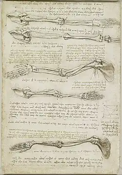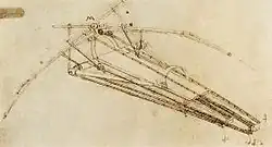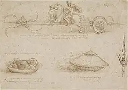 Revered for his technological ingenuity, he conceptualised flying machines, a type of armoured fighting vehicle, concentrated solar power, a ratio machine that could be used in an adding machine,[6][7] and the double hull. Relatively few of his designs were constructed or were even feasible during his lifetime, as the modern scientific approaches to metallurgy and engineering were only in their infancy during the Renaissance. Some of his smaller inventions, however, entered the world of manufacturing unheralded, such as an automated bobbin winder and a machine for testing the tensile strength of wire. He made substantial discoveries in anatomy, civil engineering, hydrodynamics, geology, optics, and tribology, but he did not publish his findings and they had little to no direct influence on subsequent science.[8]