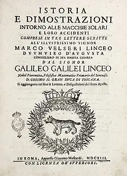 Letters on Sunspots (Istoria e Dimostrazioni intorno alle Macchie Solari) was a pamphlet written by Galileo Galilei in 1612 and published in Rome by the Accademia dei Lincei in 1613. In it, Galileo outlined his recent observation of dark spots on the face of the Sun.[1] His claims were significant in undermining the traditional Aristotelian view that the Sun was both unflawed and unmoving.[2] The Letters on Sunspots was a continuation of Sidereus Nuncius, Galileo's first work where he publicly declared that he believed that the Copernican system was correct.[3]