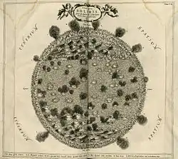 Most readers of the time did not have a telescope, so could not see sunspots for themselves – they relied on descriptions and illustrations to make clear what they looked like.[53][54] For this reason the quality and number of illustrations was essential in building public understanding. Scheiner's book of letters had contained illustrations of sunspots which were mostly 2.5 cm in diameter, leaving little space for detail and portraying sunspots as solid, dark entities. Scheiner himself had described them as 'not terribly exact' and 'drawn without precise measurement'. He also indicated that his drawings were not to scale, and the spots in his illustration had been drawn disproportionately large 'so that they would be more conspicuous.'[40] A reader looking at these illustrations might be inclined to agree with Scheiner's view that sunspots were probably planets.
