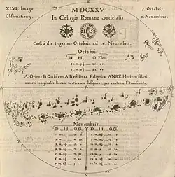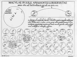 Although the sunspots were constantly changing position, Scheiner presented his observations over a period of six weeks in a single fold out plate.[14] All of his figures are small except for the observations in the top left corner. He admitted to his readers that his drawings were not made to scale, and that other factors such as variations in the weather, lack of time, or other impediments may have reduced their accuracy.[14] Scheiner also showed the formation of spots in different orientations. Sometimes the configurations of the spots were linear following consecutive days, but the orientations became more complex over time that there was a lack of an obvious pattern.[14]