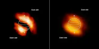 In the 1970s, astronomers found unexpectedly high levels of infrared emissions from Titan.[10] One possible explanation for this was the surface was warmer than expected, due to a greenhouse effect. Some estimates of the surface temperature even approached temperatures in the cooler regions of Earth. There was, however, another possible explanation for the infrared emissions: Titan's surface was very cold, but the upper atmosphere was heated due to absorption of ultraviolet light by molecules such as ethane, ethylene and acetylene.[10]