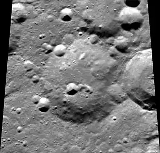 The fine detail along the rim of this crater has been worn down by a history of lesser impacts, leaving only a round-edged depression in the surface. The more recent impact Lindblad F intrudes slightly into the eastern rim, and several tiny craters lie along the northern and southwest rim. The interior surface is marked by a formation of adjacent craterlets just to the south and southwest of the midpoint.
