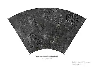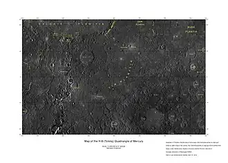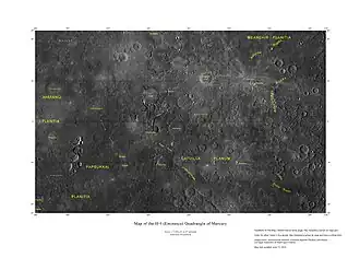 The surface of the planet Mercury has been divided into fifteen quadrangles, designated H-1 to H-15 (the 'H' stands for Hermes, the Greek equivalent of Mercury).[1] The quadrangles are named for prominent surface features visible within each area.[1] The quadrangles were initially named for albedo features, as these were the most prominent features visible before mapping was carried out by spacecraft. The mapping carried out with the images obtained by the Mariner 10 flybys in 1974 and 1975 led to nine of the quadrangles being renamed for newly mapped prominent features.[1] The remaining six quadrangles were completely unmapped by Mariner 10 and were still referred to by their albedo feature names. Following the arrival of MESSENGER in orbit in 2011, these six quadrangles were mapped and renamed.[2] The base mosaic used in the new maps was produced with orbital images by the MESSENGER Team and released by NASA’s Planetary Data System on March 8, 2013. This global mosaic includes complete coverage of Mercury’s surface.