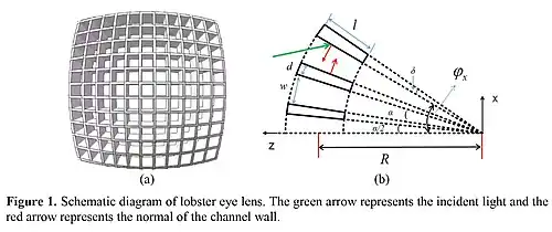 While most animals have refractive eyes, lobsters and other crustaceans have reflective eyes.[2] The eyes of a crustacean contain clusters of cells, each reflecting a small amount of light from a particular direction. Lobster-eye optics technology mimics this reflective structure. This arrangement allows the light from a wide viewing area to be focused into a single image. The optics are made of microchannel plates. X-ray light can enter small tubes within these plates from multiple angles, and is focused through grazing-incidence reflection that gives a wide field of view. That, in turn, makes it possible to locate and image transient astronomical events that could not have been predicted in advance.[3]