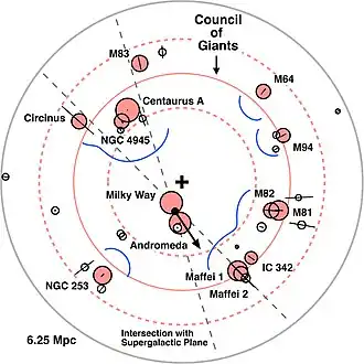 The so-called Council of Giants is a ring of twelve large galaxies surrounding the Local Group in the Local Sheet, with a radius of 3.75 Mpc (12.2 Mly).[4] Ten of these are spirals, while the remaining two are ellipticals. The two ellipticals (Maffei 1 and Centaurus A) lie on opposite sides of the Local Group.