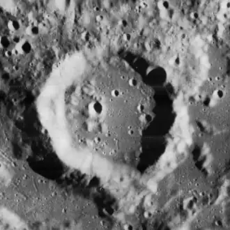Lohrmann is a small lunar impact crater that is located to the west of the Oceanus Procellarum, near the western limb of the Moon. It lies to the north of the dark-floored walled plain Grimaldi, and just to the south of the crater Hevelius.