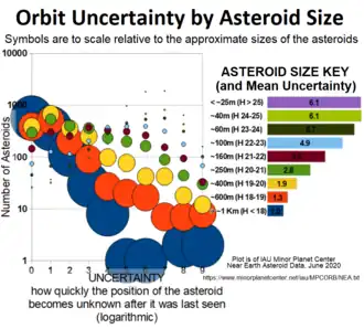 The orbits of kilometre class NEAs are generally well known, though a few have been lost. However, large numbers of smaller NEAs have highly uncertain orbits[4]